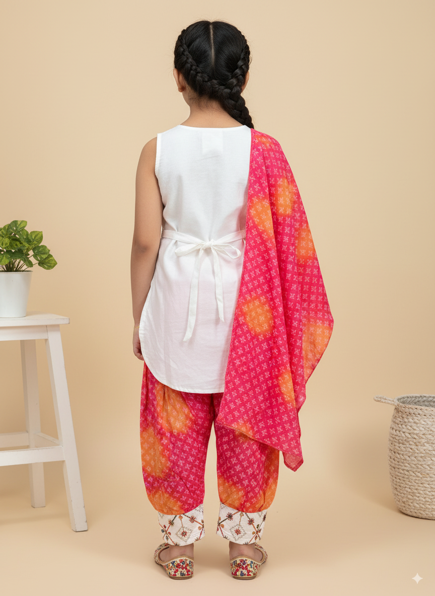 Add a touch of traditional elegance to your little one’s festive wardrobe with the Pink Pearl Patiala Set. This stunning outfit includes a beautifully embroidered white kurti with golden threadwork and mirror accents, paired with vibrant pink-orange Patiala bottoms featuring delicate printed motifs. A matching dupatta enhances the outfit’s charm, while the stylish embroidered handbag adds a playful yet graceful finishing touch.