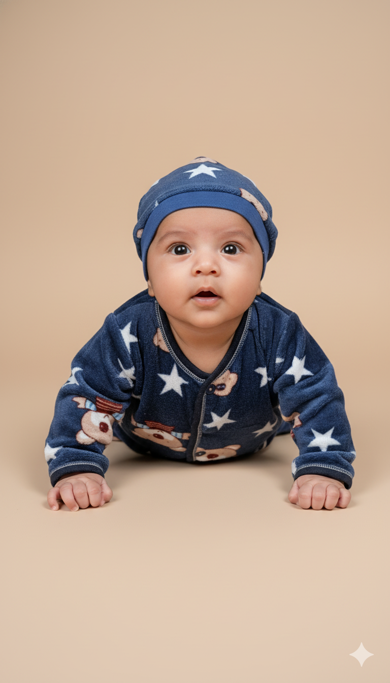 Keep your little one warm, cozy, and absolutely adorable with our SnuggleStar Teddy Winter Wear Set. Made from ultra-soft, plush winter fabric, this 4-piece set includes a warm full-sleeve top, comfortable pajama bottoms, a matching cap, and a soft bib—all designed with a charming teddy and star print that kids love. The gentle inner lining ensures warmth without irritation, making it perfect for cold days and nights. With its easy-to-wear design and stretchable waist, this set provides both comfort and flexibility for active little babies. Ideal for daily wear, outdoor outings, or cozy cuddles at home, this winter wear set keeps your baby snug, stylish, and super cute all season long.
